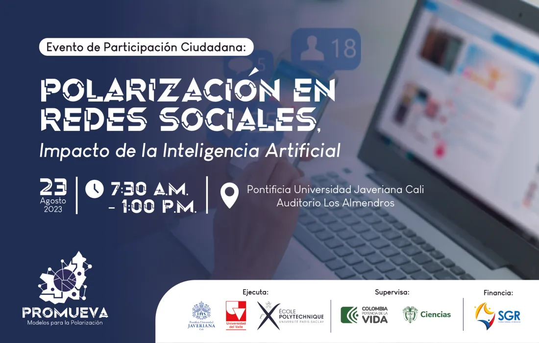 El miércoles 23 de agosto se llevará a cabo en la Pontificia Universidad Javeriana Cali el evento de participación ciudadana “Polarización en Redes Sociales: Impacto de la Inteligencia Artificial”, en el marco del proyecto Polarización en Redes Sociales con un Modelo Unificado para el Valle, PROMUEVA, financiado por el Sistema General de Regalías.